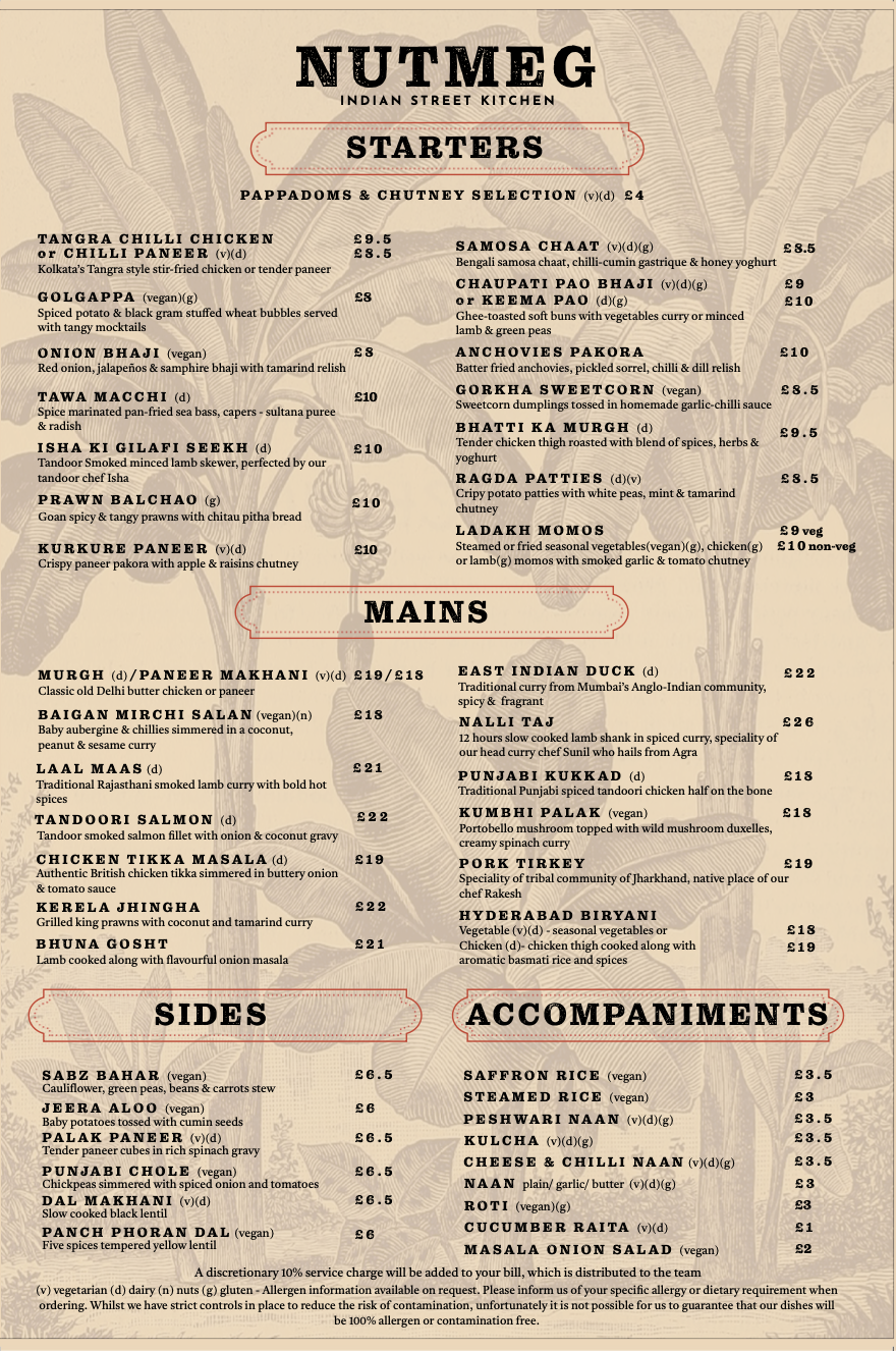 Taking inspiration from India's bustling street markets, Nutmeg Street Kitchen showcases an array of dishes, flavours, and ingredients that define Indian street market cuisine. These influences are refined into daytime and evening menus, alongside an exciting tasting menu in our gorgeous, city-centre restaurant.